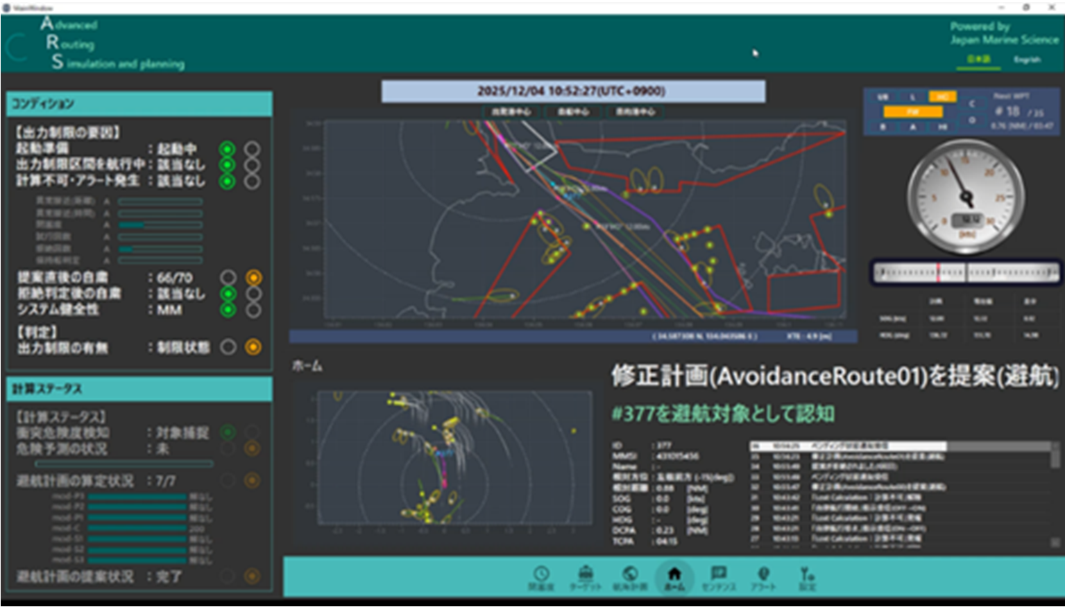 自船や周辺を航行する船舶などの行動を予測し、衝突や座礁を防止するための行動計画を策定するソフトウェア。