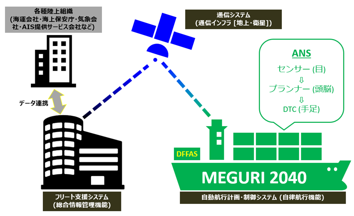 DFFAS+コンソーシアムは、自動運航船を単体の技術としてではなく、船上システム・通信システム・陸上支援システムを統合した運航システムとして設計・開発しました。