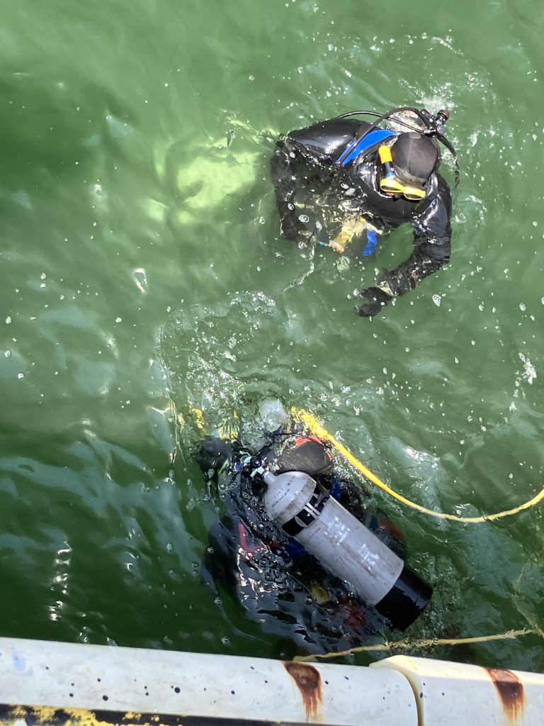 売買船時の船底検査の場合は、船級立ち合いのもと、リアルタイムで映像や音声をつないで「全体をもう1回まわってください」などの指示を受けながら動きます。約4時間くらいの潜水作業です。